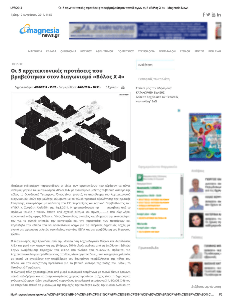 Οι 5 αρχιτεκτονικές προτάσεις που βραβεύτηκαν στον διαγωνισμό «Βόλος Χ 4». (2014, Αύγουστος 04). Magnesia news.gr. Ανακτήθηκε εδώ