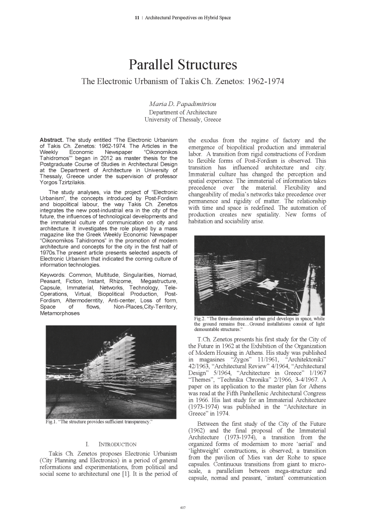 Maria D. Papadimitriou (2015) Parallel Structures. The Electronic Urbanism of Takis Ch. Zenetos: 1962-1974 , pp.407-414