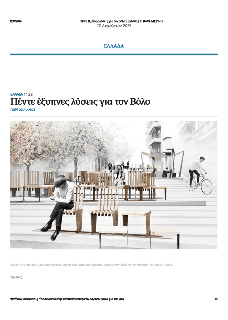 Λιάλιος, Γ. (2014, Αύγουστος 12) Πέντε έξυπνες λύσεις για τον Βόλο. Η Καθημερινή. Ανακτήθηκε εδώ